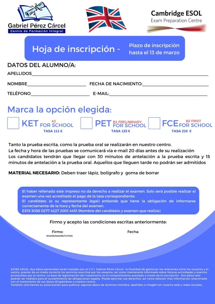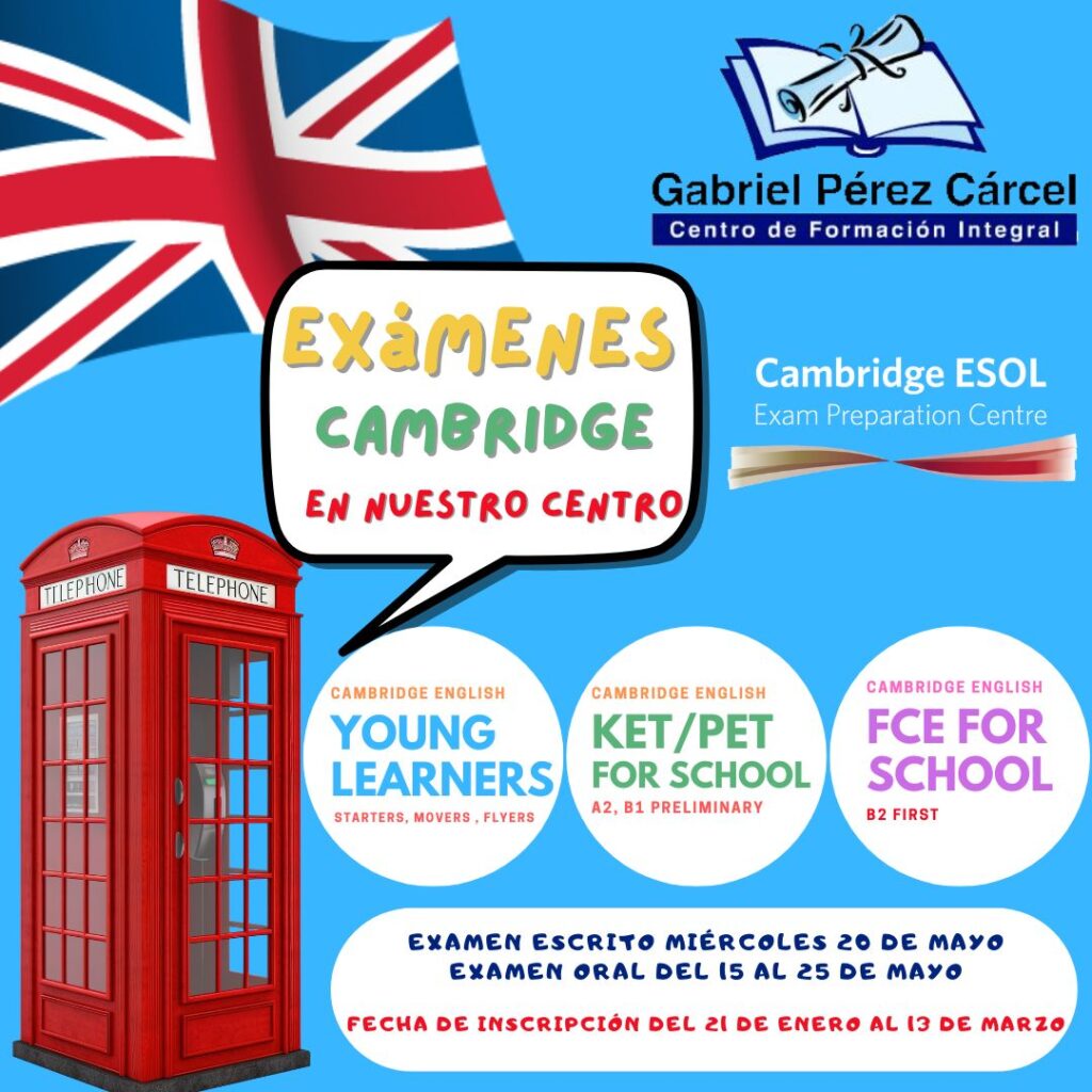 De nuevo este año,  del 21 de enero al 13  de marzo  de 2026, se abre el plazo de inscripción para los exámenes oficiales de Cambridge English YLE (STARTERS, MOVERS AND FLYERS) y  para los exámenes PET FOR SCHOOL (B1 PRELIMINARY) FCE FOR SCHOOL (B2 FIRST)
