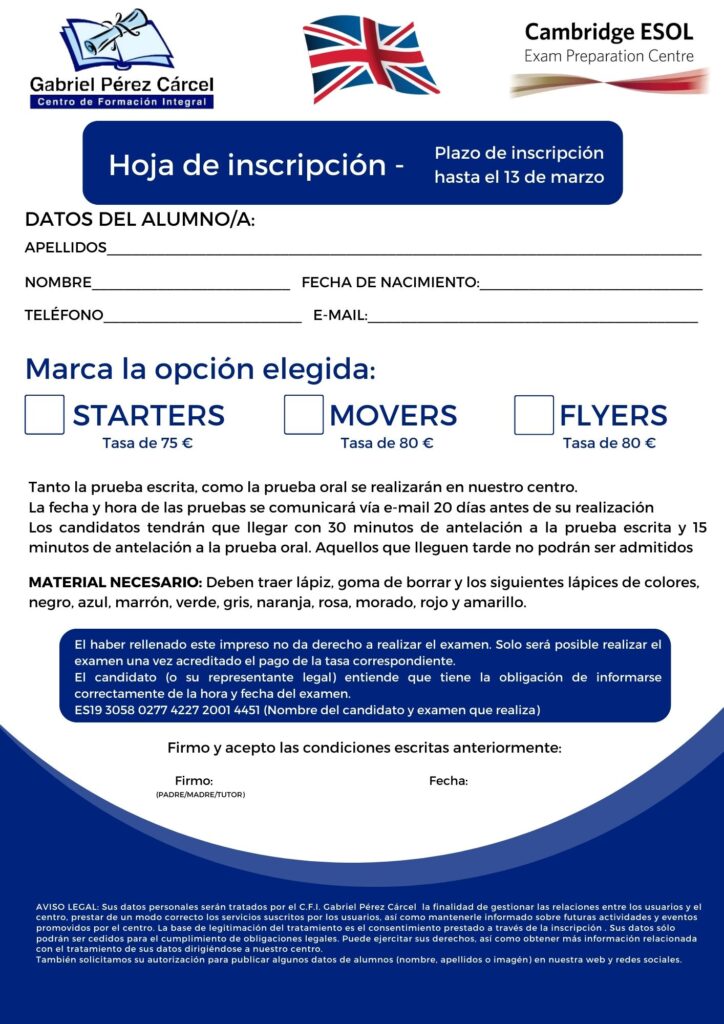 Formulario de inscripción para Starters, Movers and Flyers